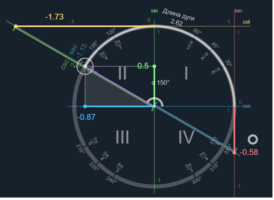 - Мысленно начертим треугольник из радиуса, абсциссы и ординаты. $x<0$ $y>0$