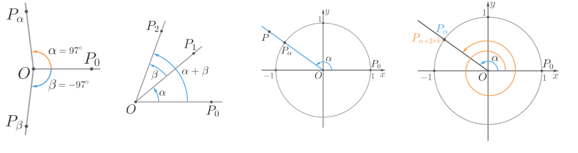 Е.Т.О. построение: Пусть единичная окружность пересекает положительную полуось оси абсцисс в точке $P_0$, которая имеет координаты $(1;0)$. Неподвижный луч $OP_0$ назовем начальным лучом. Повернем подвижный луч на угол $97^o$ от начального положения $OP_0$ до положения $OP\alpha$. Обозначим точку пересечения луча с единичной окружностью $P\alpha$. В этом случае точка получена поворотом точки на угол $\alpha$ вокруг начала координат (угол может измеряться как в градусах, так и в радианах). Говорят, что точка $P\alpha$ единичной окружности соответствует углу поворота $\alpha$ . Выполним последовательно два поворота: сначала повернем подвижный луч вокруг центра поворота $O$ от положения $P_0$ до положения $P\alpha$ на угол $\alpha$, затем повернем подвижный луч относительно центра $O$ от положения $P\beta$ до положения на угол $\beta$. В итоге получим точку $P(\alpha+\beta)$, соответствующую углу $\alpha+\beta$. Если повернуть подвижный луч сперва на угол $\alpha$ , а затем еще сделать $k$ полных оборота ($+2\pi k$), то, конечно получим точку $P\alpha$. Значит, добавка к углу $2\pi k$ точку не меняет! Периодичность!