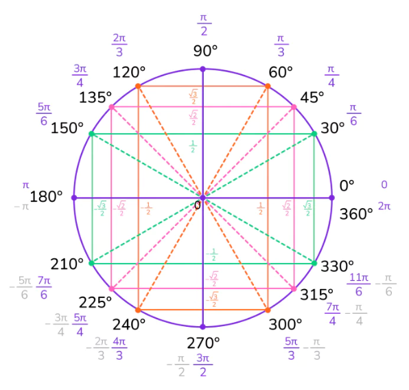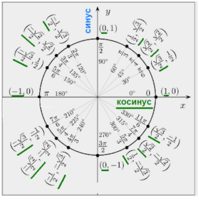 - Тогда для всех несократимых $\frac{n\cdot\pi}{6}$ или $\frac{m\cdot\pi}{3}$ координатами будут $\pm\frac{1}{2}$ или $\pm\frac{\sqrt{3}}{2}$ .