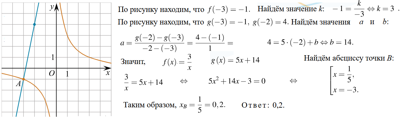 Пример 12: На рисунке изображены графики функций видов $f(x)=\frac{k}{x}$ и $g(x)=ax+b$ пересекающиеся в точках $A$ и $B$. Найдите абсциссу точки $B$.