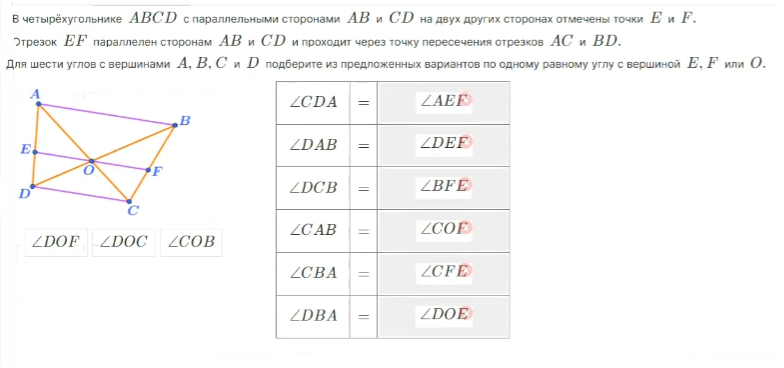 - соответственные углы равны: ∠ 1 = ∠ 5, ∠ 4 = ∠ 8, ∠ 2 = ∠ 6, ∠ 3 = ∠ 7.