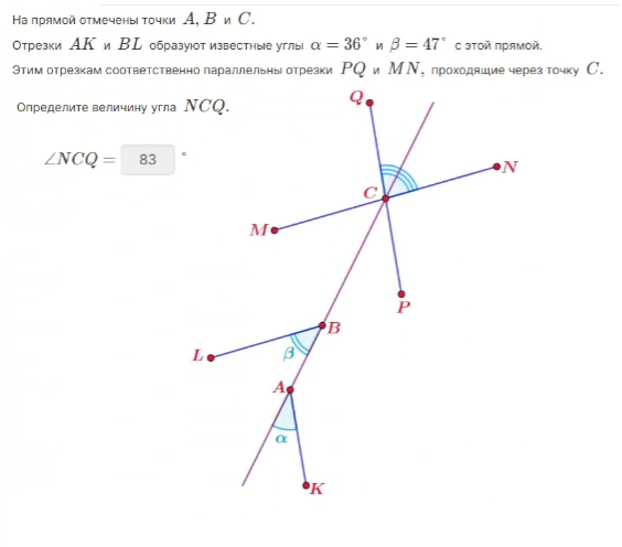 - Решение: Углы ∠ВАМ и ∠АВК - односторонние от секущей АВ. Их сумма ∠ВАМ + ∠АВК = 180°.